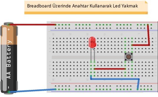 Breardboard üzerinde anahtar kullanarak led yakma şeması şu şekildedir.